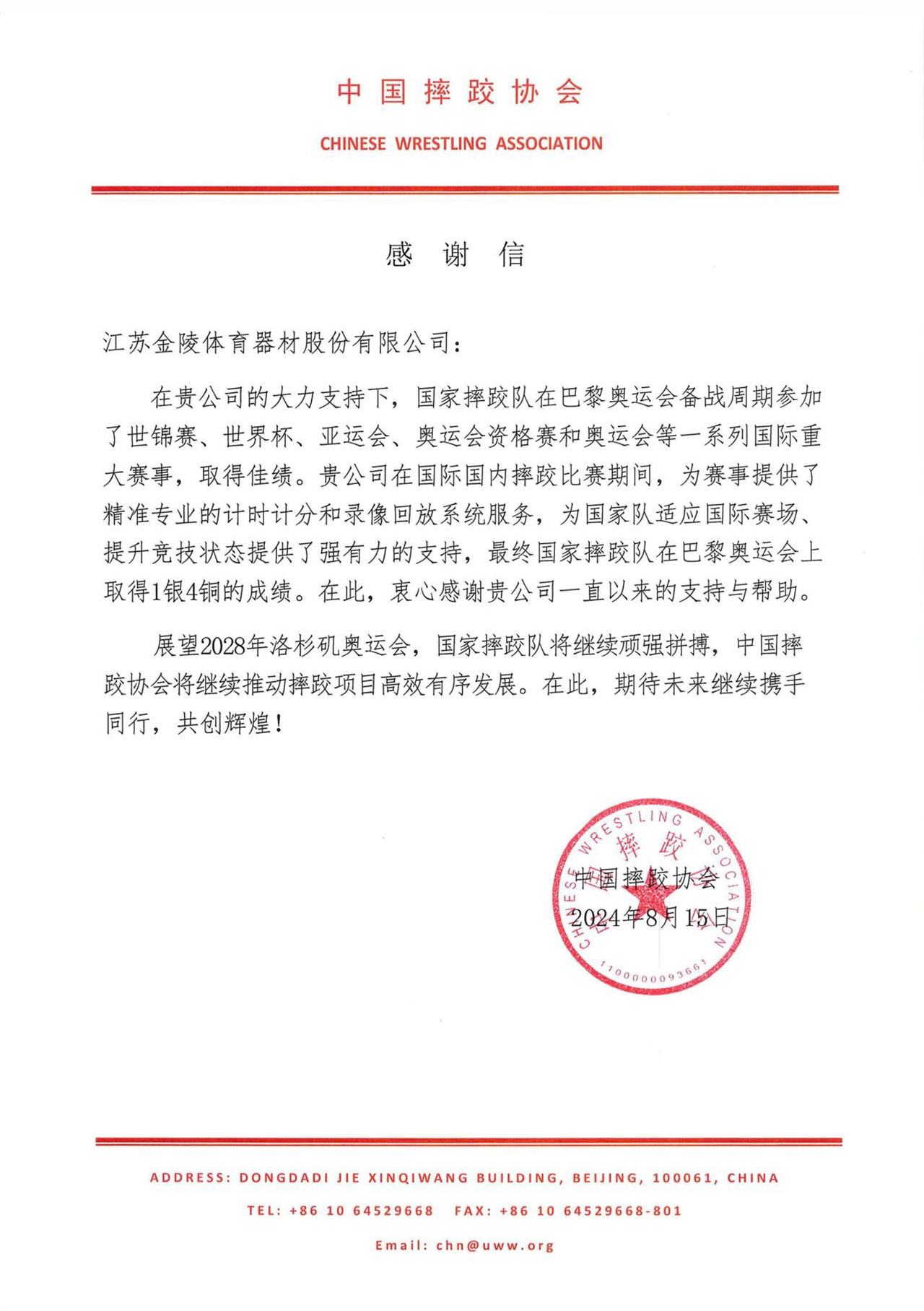 信中说:在贵公司的大力支持下,国家摔跤队在巴黎奥运会备战周期参加了世锦赛、世界杯、亚运会、奥运会资格赛和奥运会等一系列国际重大赛事,取得佳绩。贵公司在国际国内摔跤比赛期间,为赛事提供了精准专业的计时计分和录像回放系统服务,为国家队适应国际赛场,提升竞技状态提供了强有力的支持,最终国家摔跤队在巴黎奥运会上取得1银4铜的成绩。在此,衷心感谢贵公司一直以来的支持与帮助。